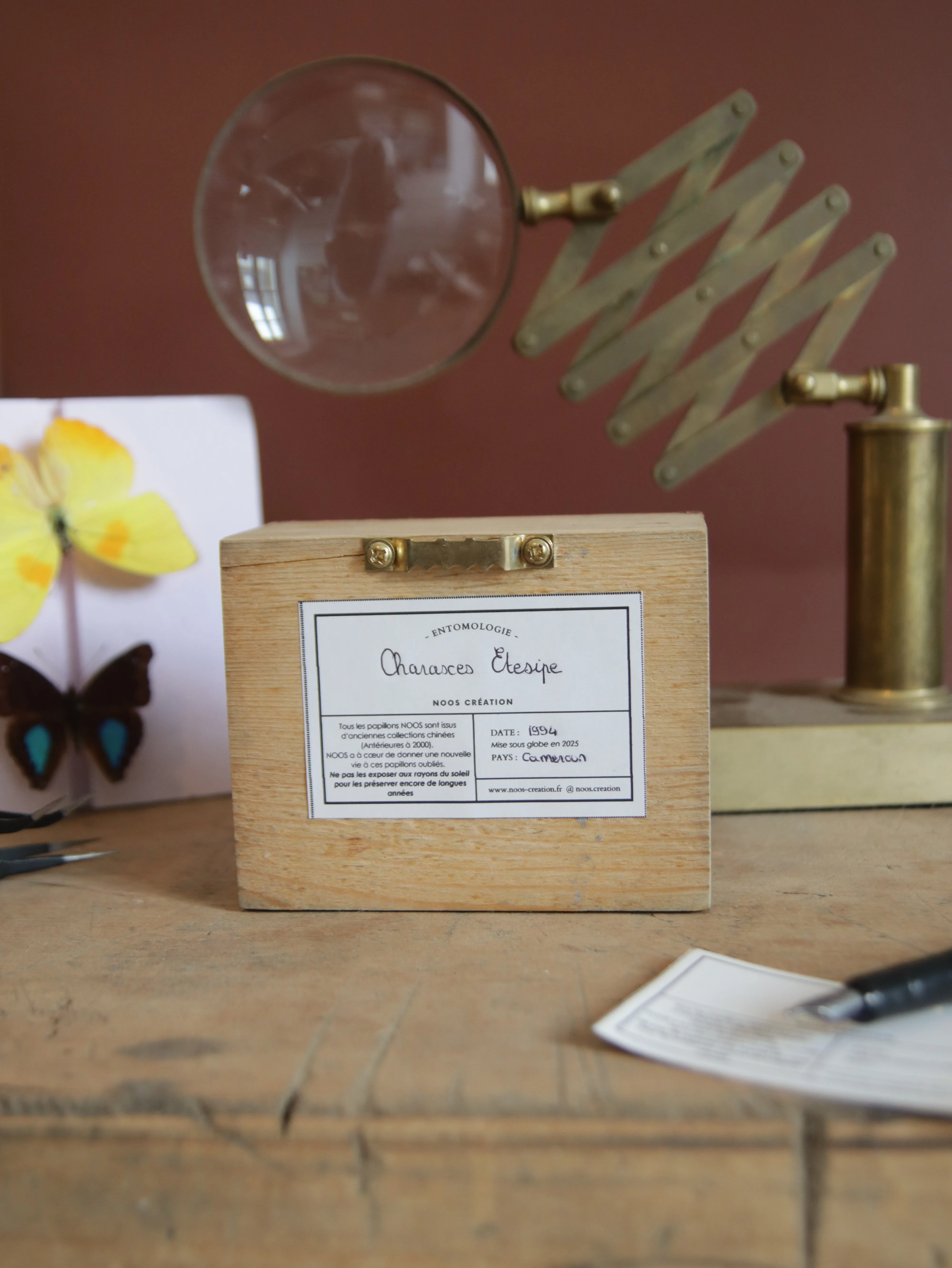 Voyagez à travers le temps avec ce Charaxes etesipe d’exception. Récolté en 1994 au Cameroun, ce papillon a traversé les décennies pour s’imposer aujourd’hui comme une véritable pièce maîtresse de décoration.
