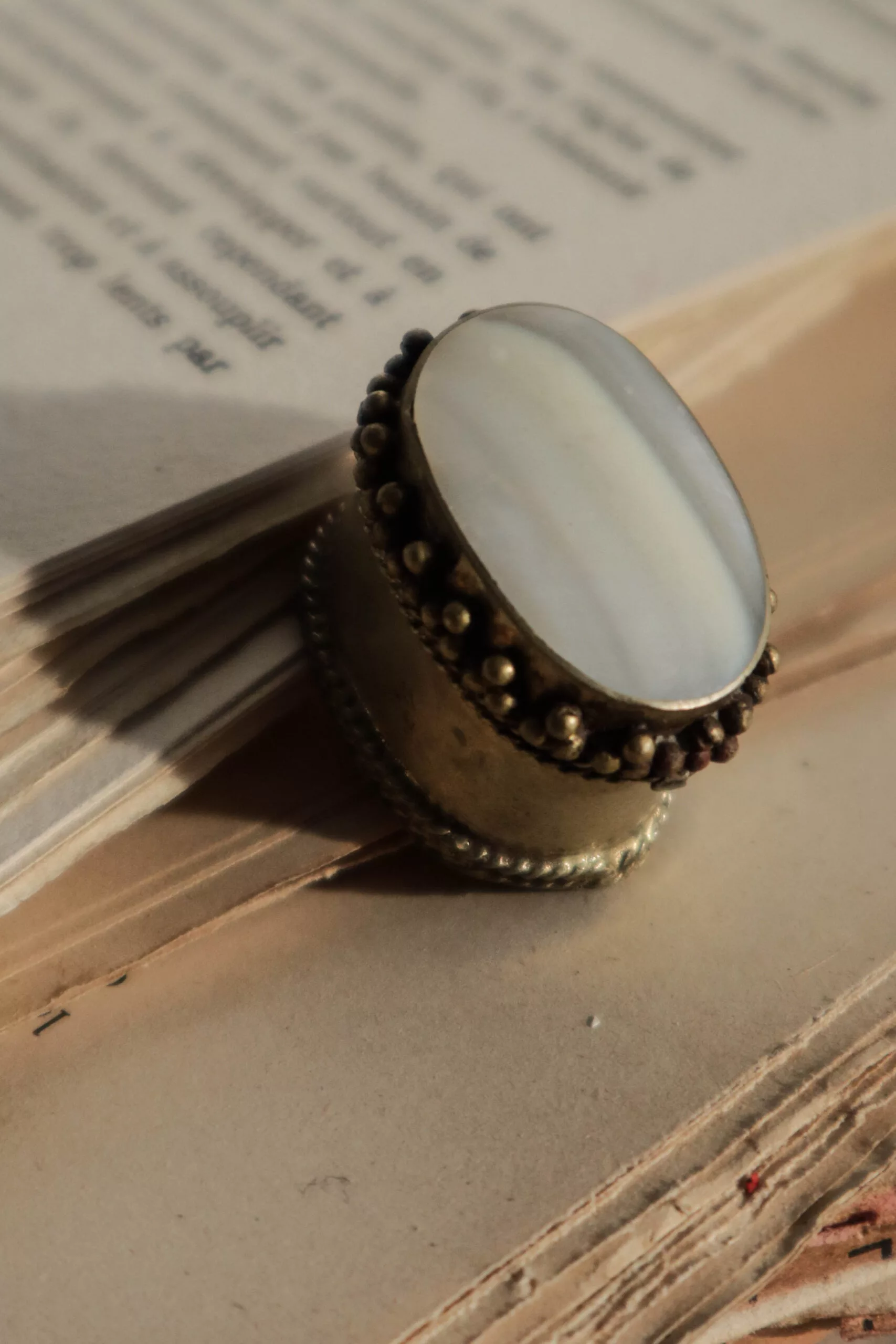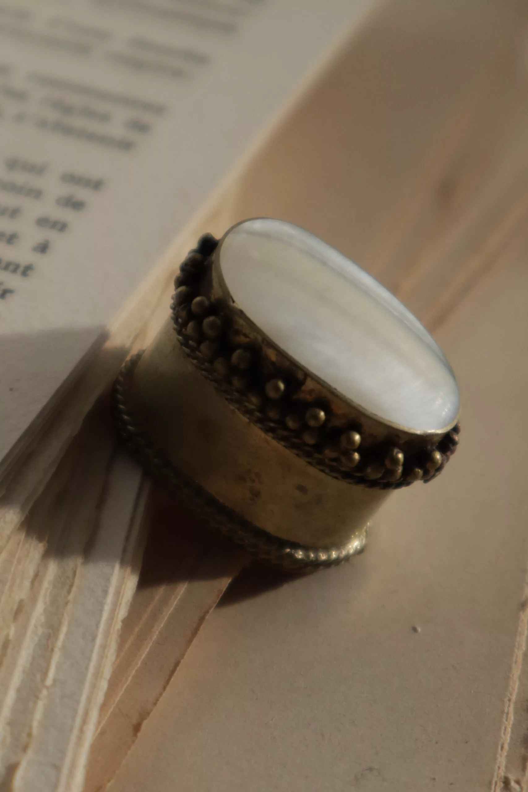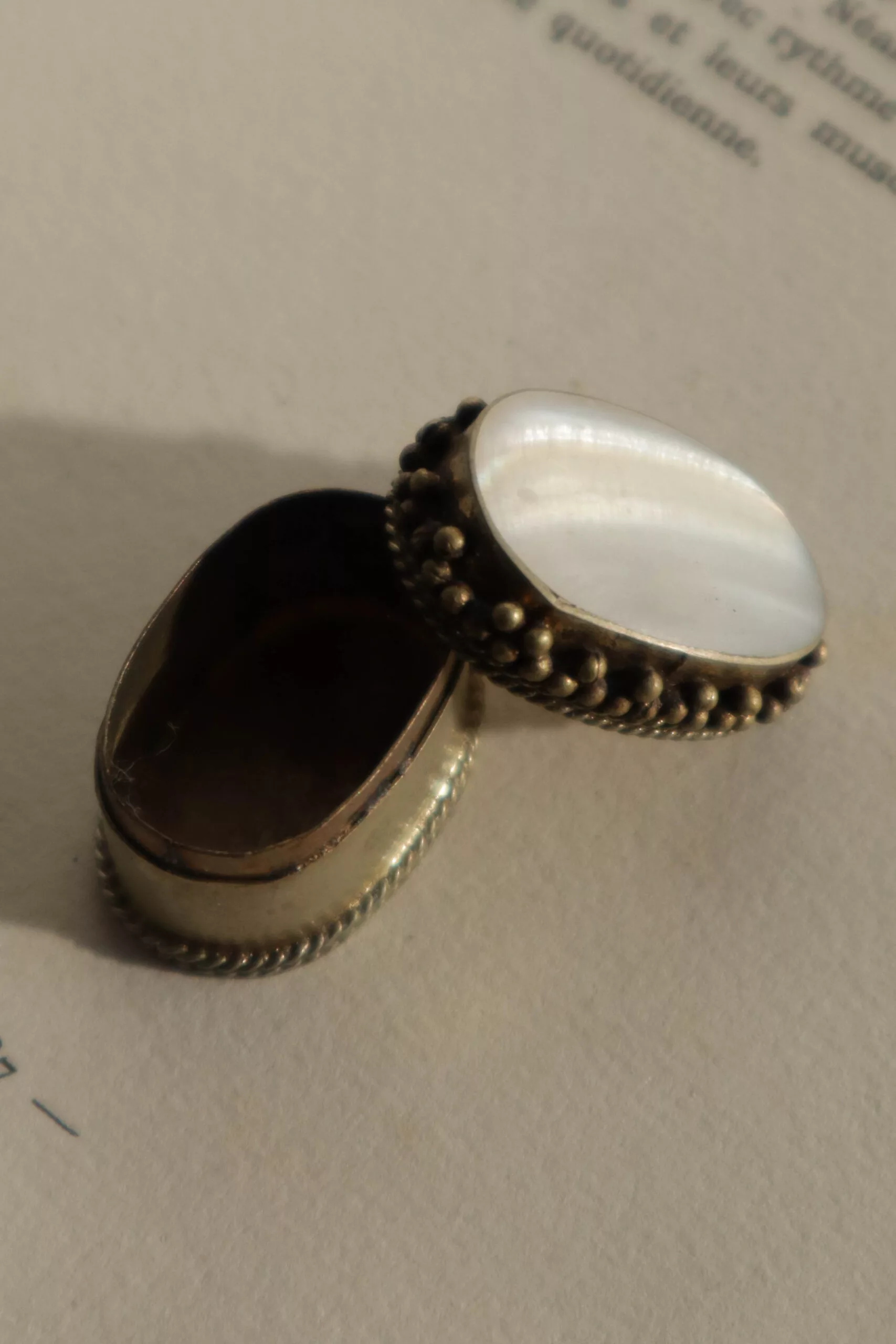 Ancien pilulier en metal avec une pierre blanche sur le dessus