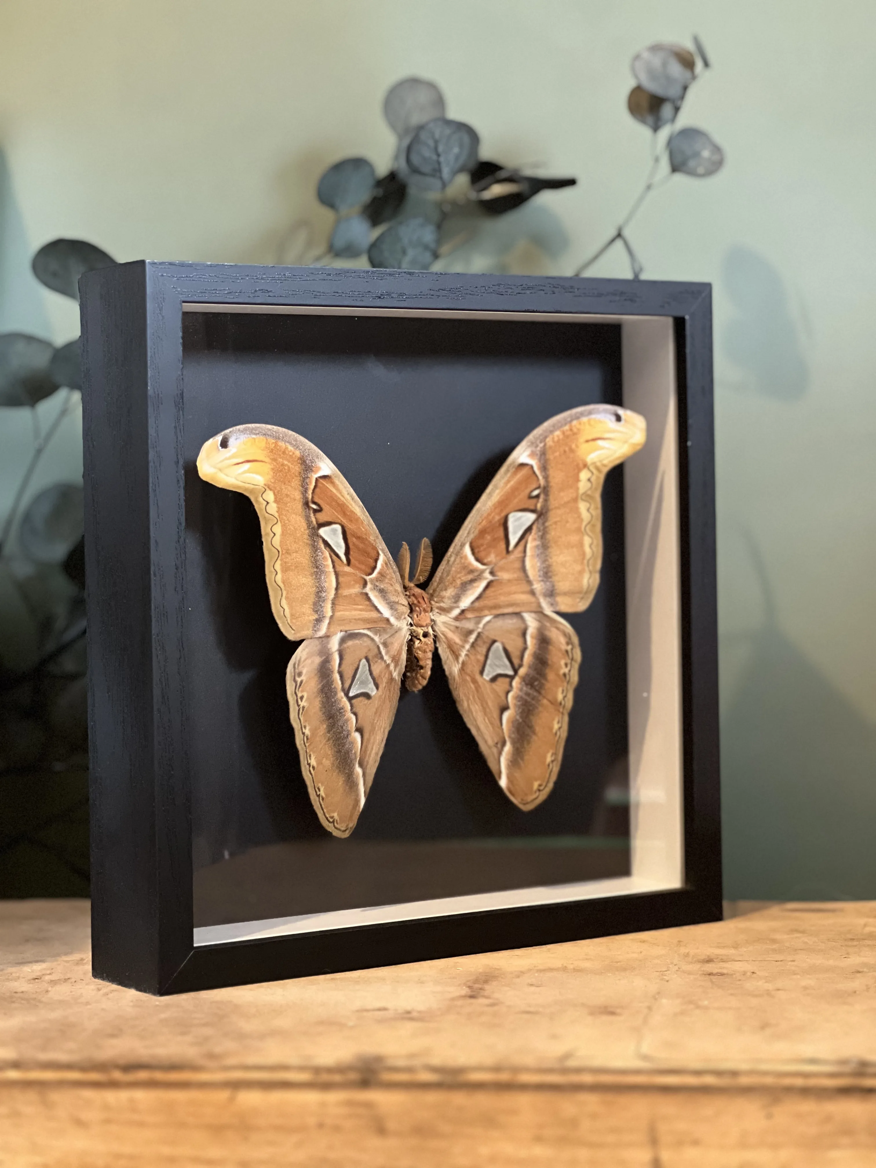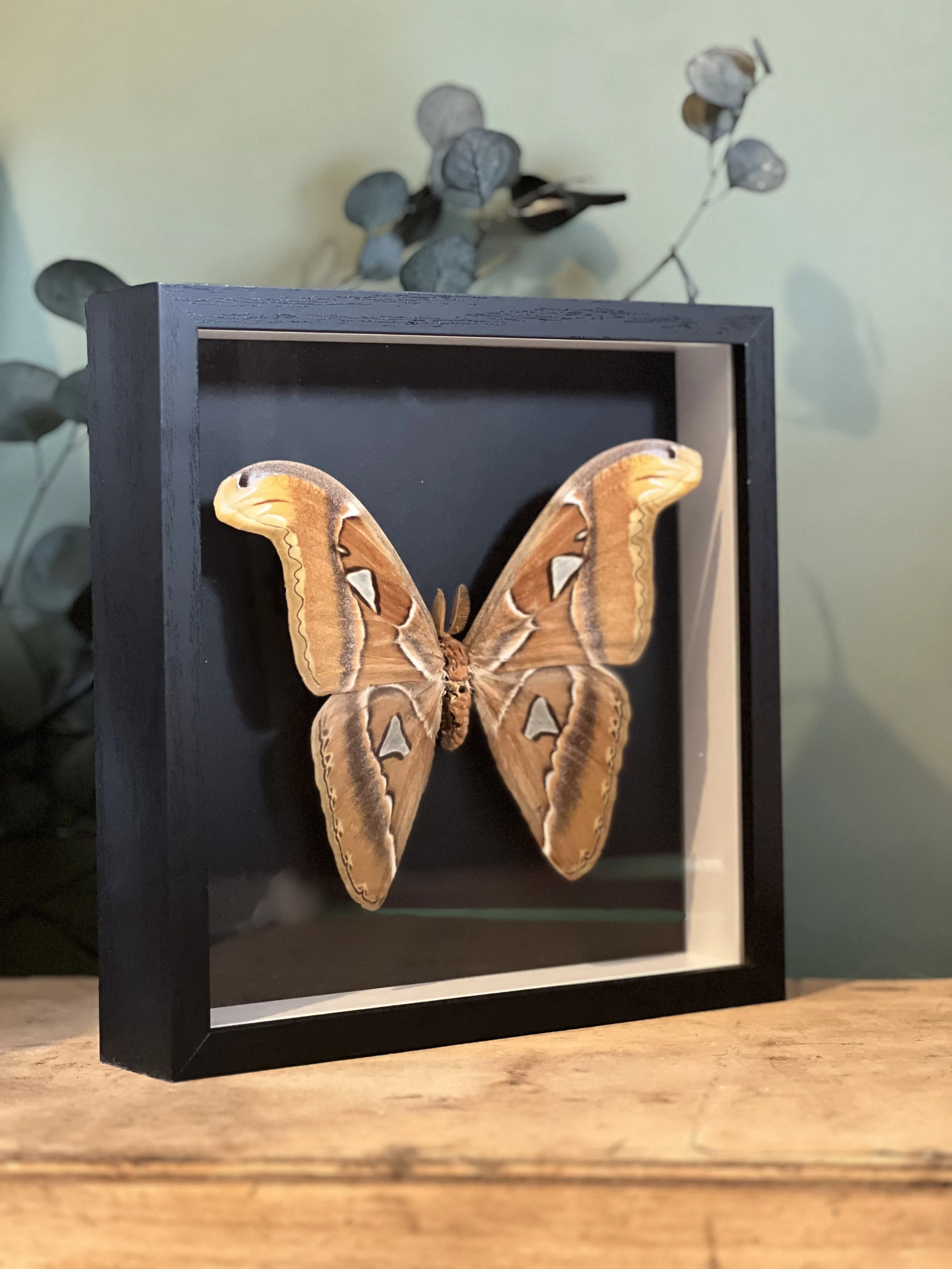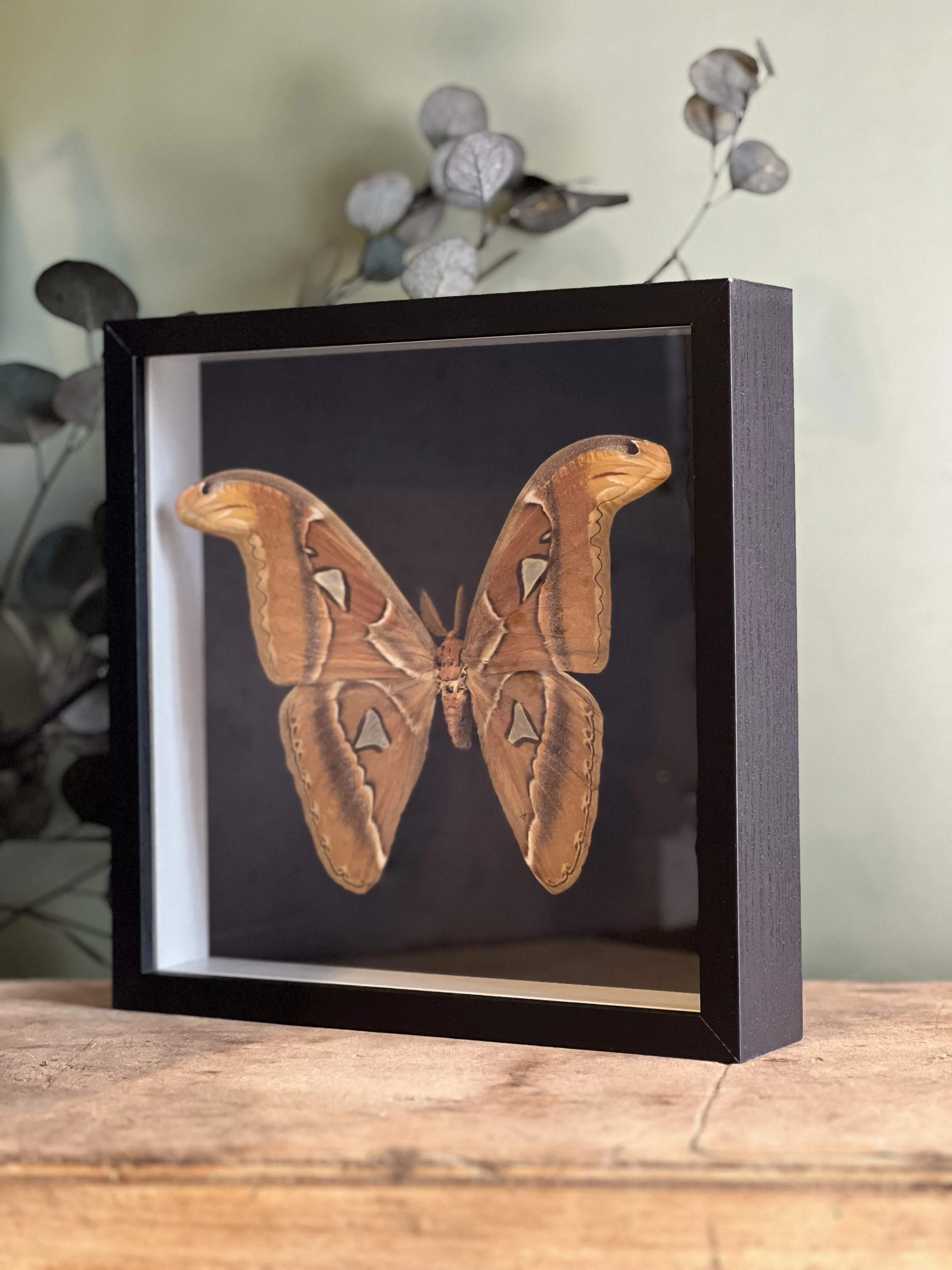 Superbe spécimen d’Attacus Atlas , collecté en décembre 1977 en Malaisie , présenté dans un cadre noir avec vitre en verre afin d’assurer sa protection tout en mettant en valeur son élégance naturelle.