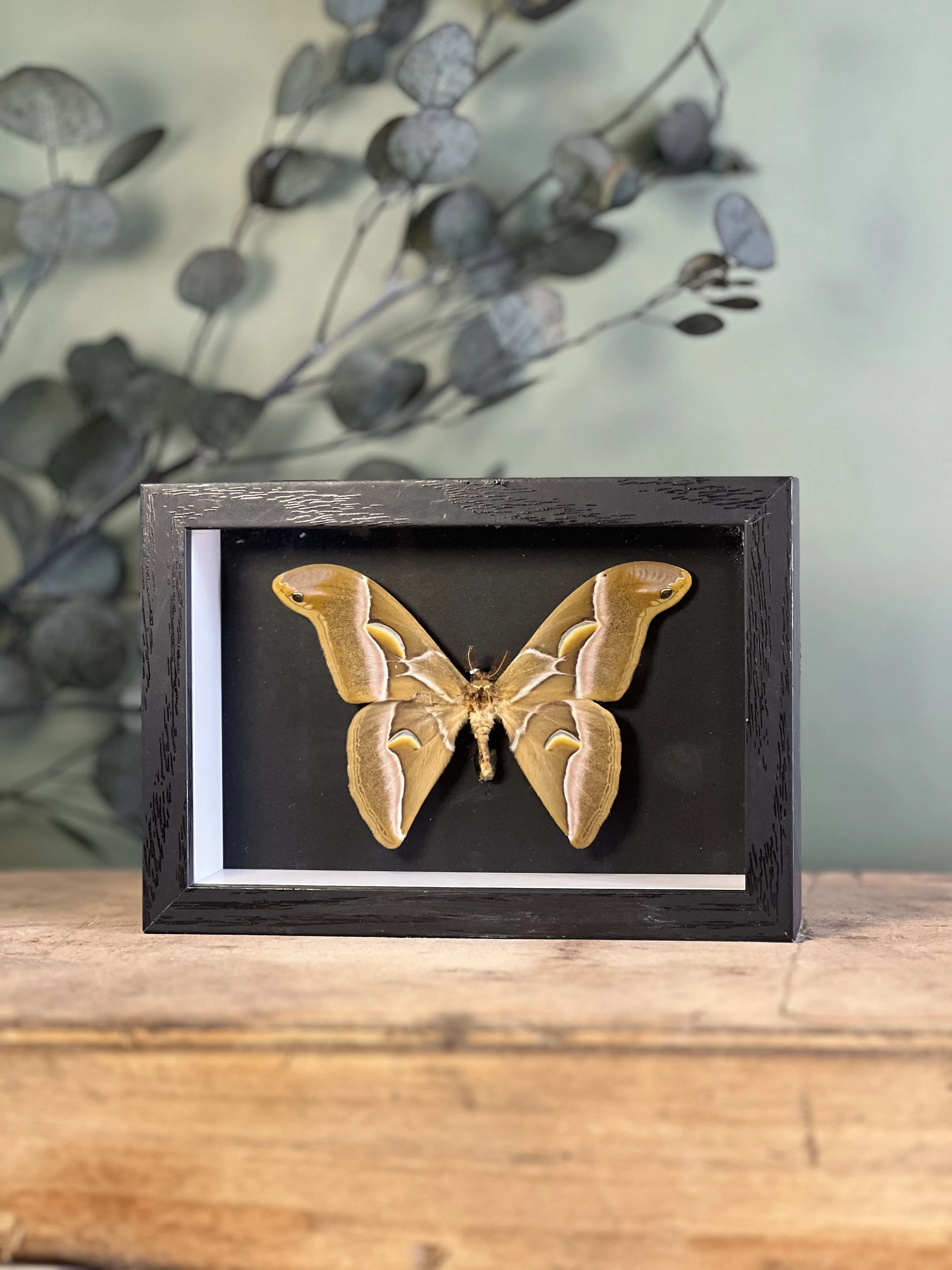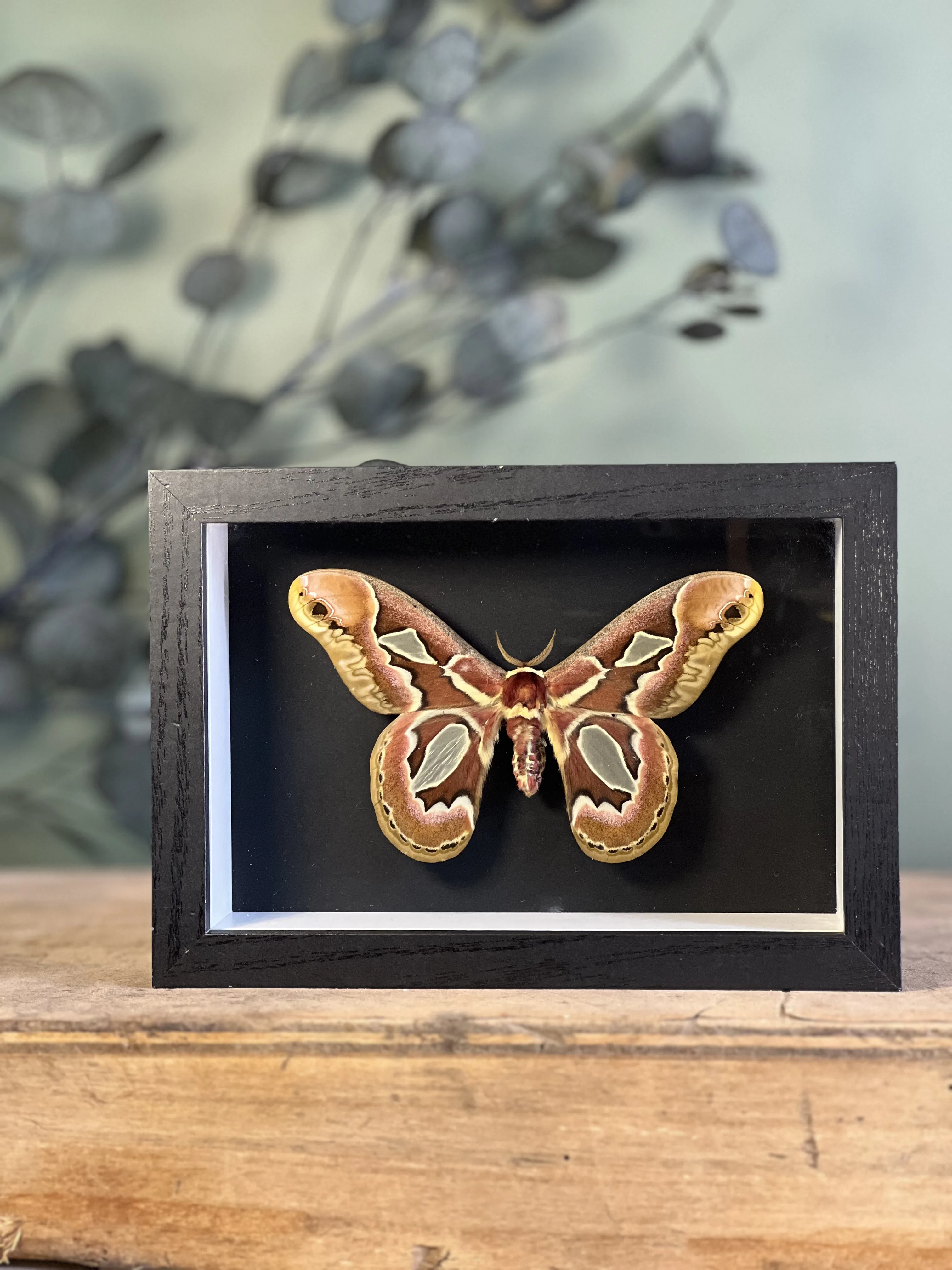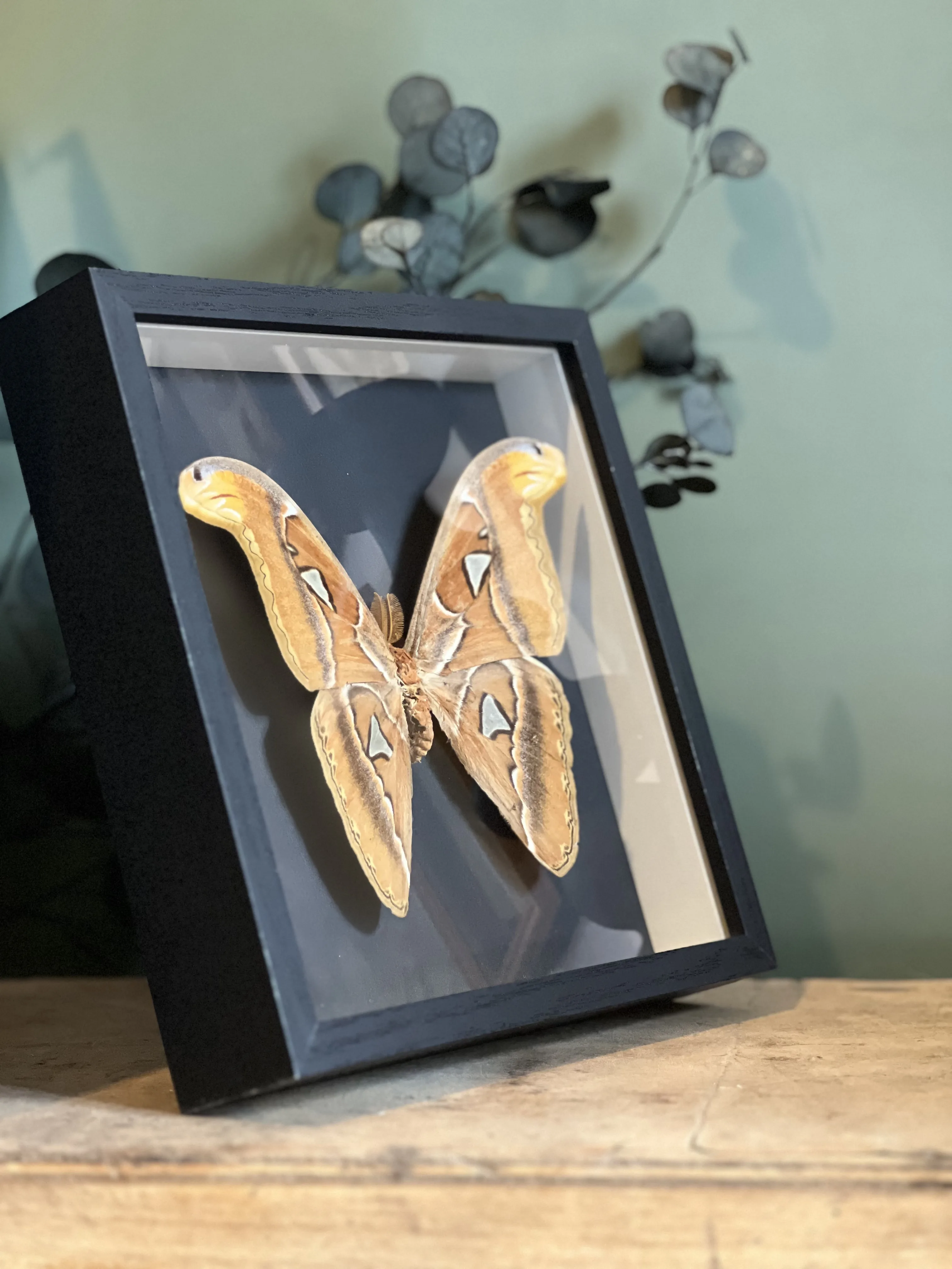 Superbe spécimen d’Attacus Atlas , collecté en décembre 1977 en Malaisie , présenté dans un cadre noir avec vitre en verre afin d’assurer sa protection tout en mettant en valeur son élégance naturelle.
