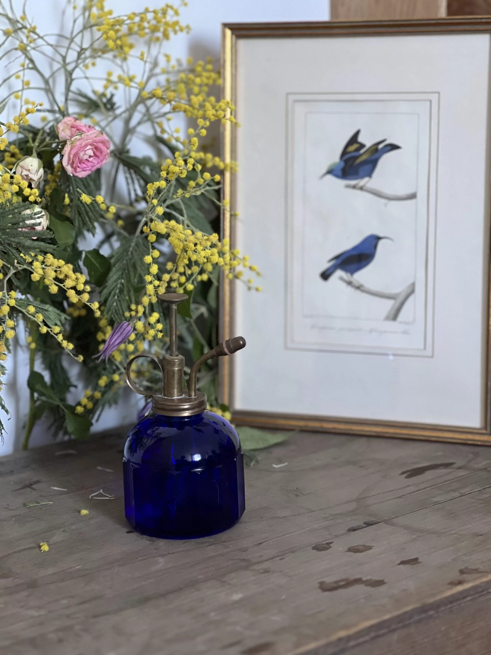 Très beau brumisateur à piston en métal et verre bleu