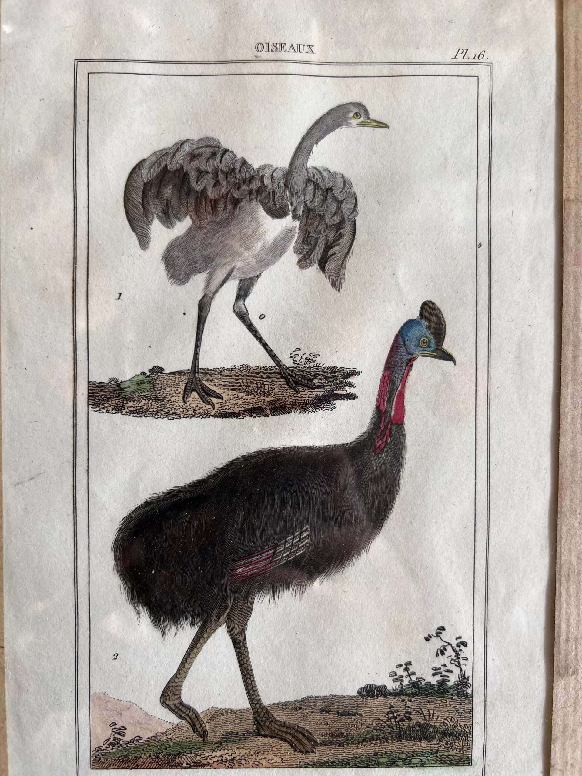 Ancienne gravure du 19ᵉ par Buffon rehaussée finement à l’aquarelle, représentant Le Touiou (1) et Le Casoar (2)