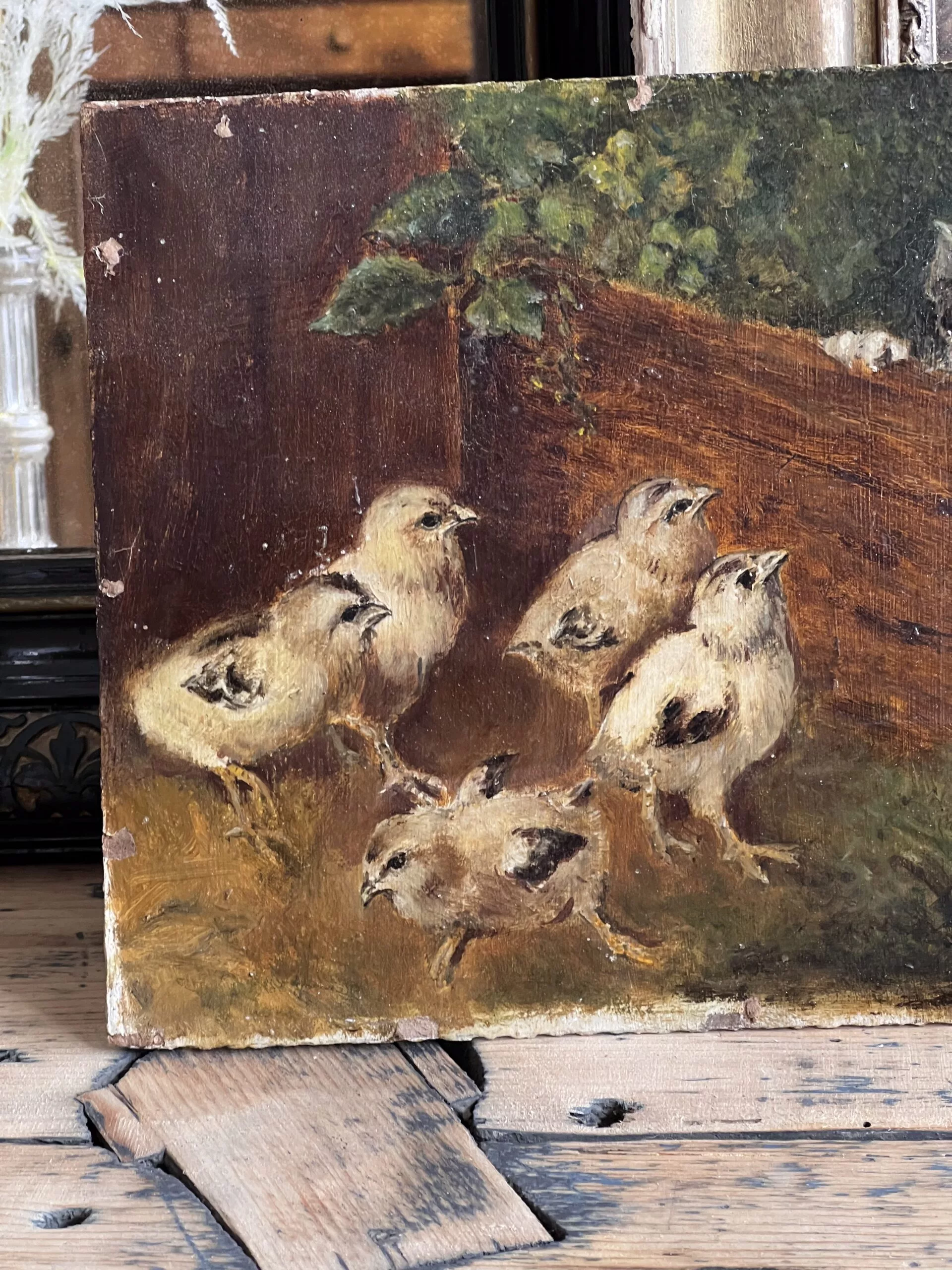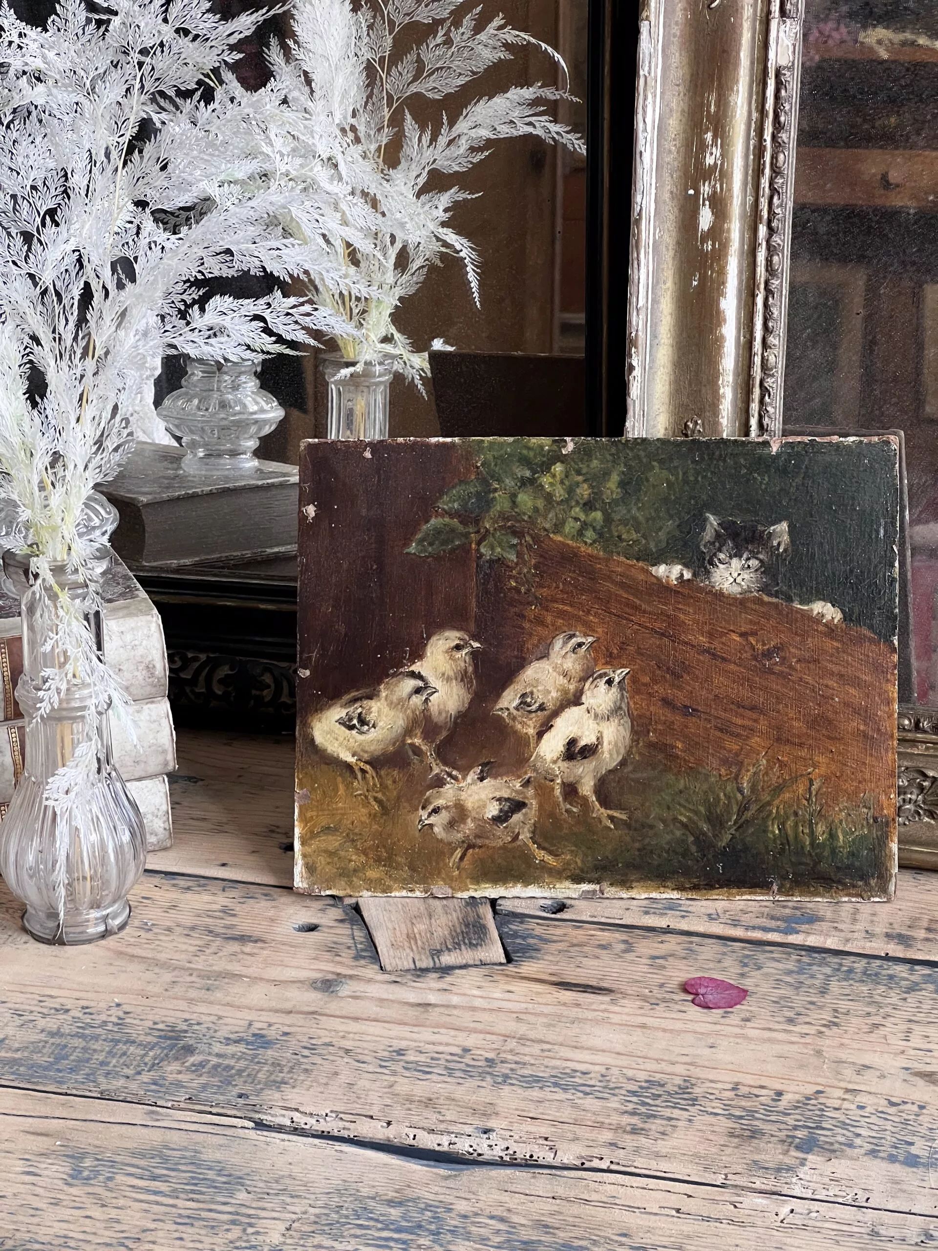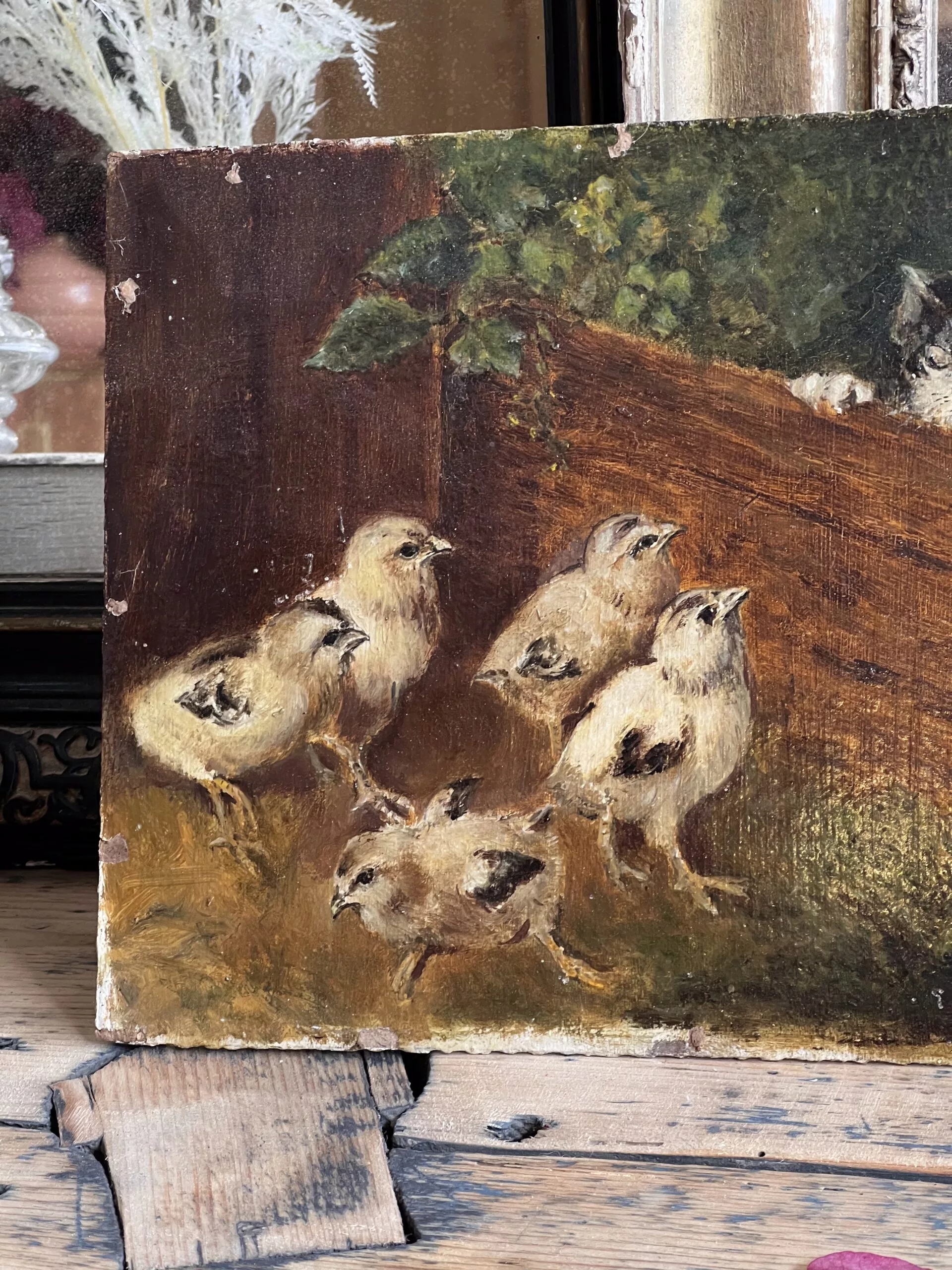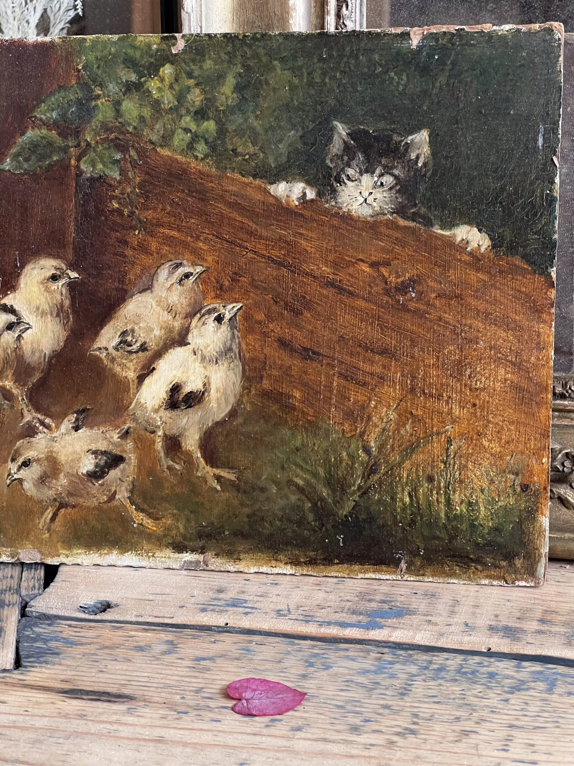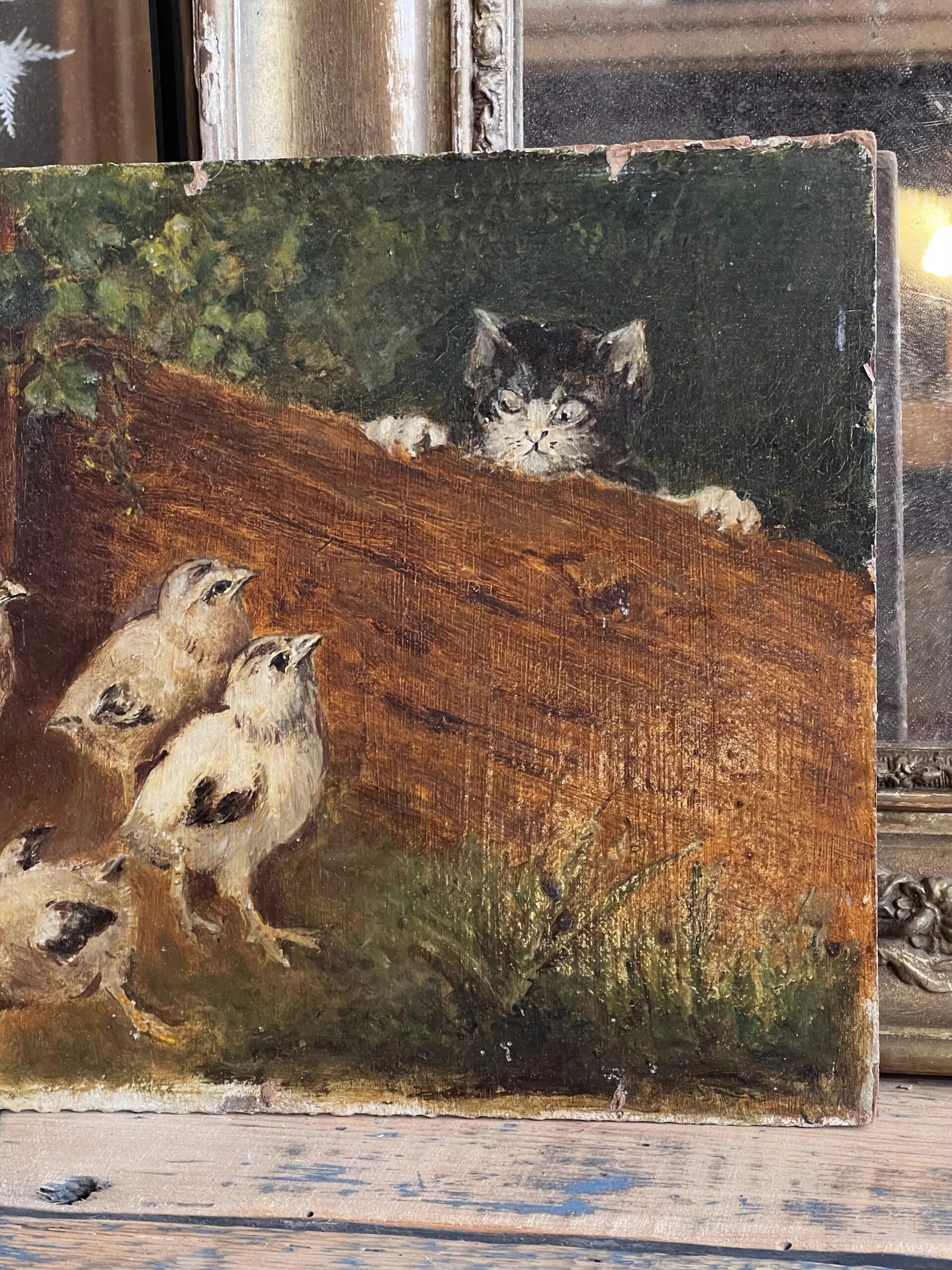 Très jolie petite huile sur panneau d’un chaton observant 5 poussins