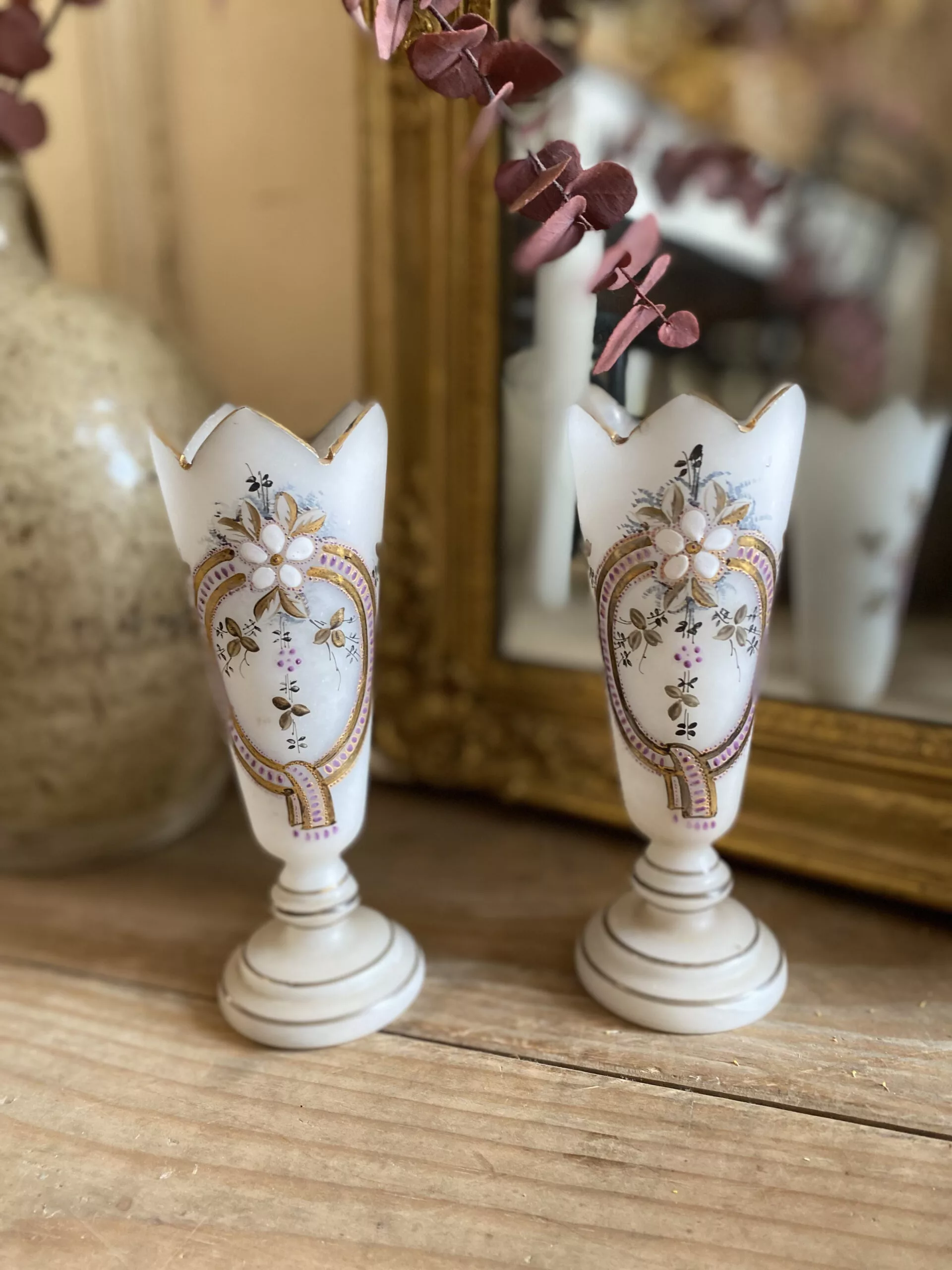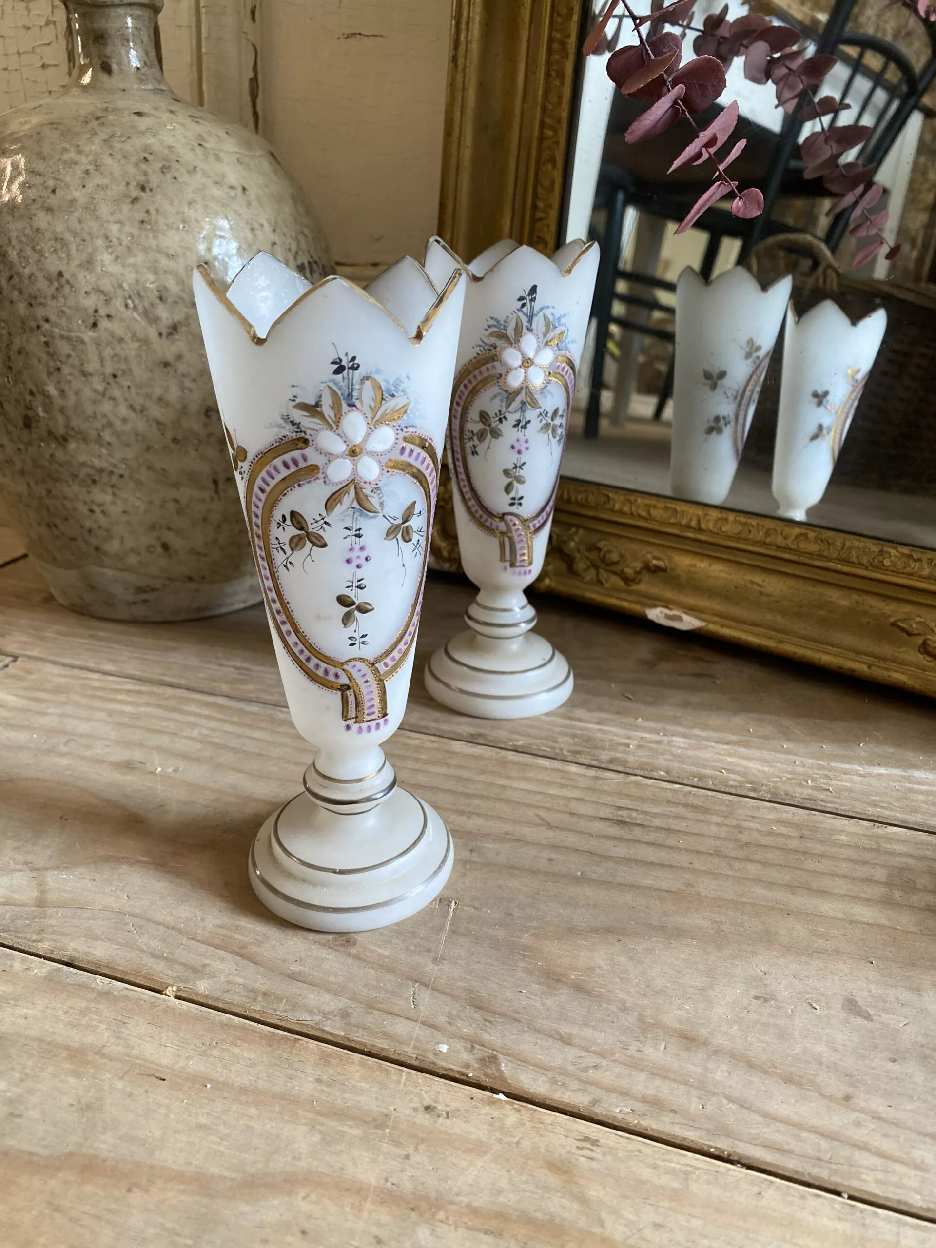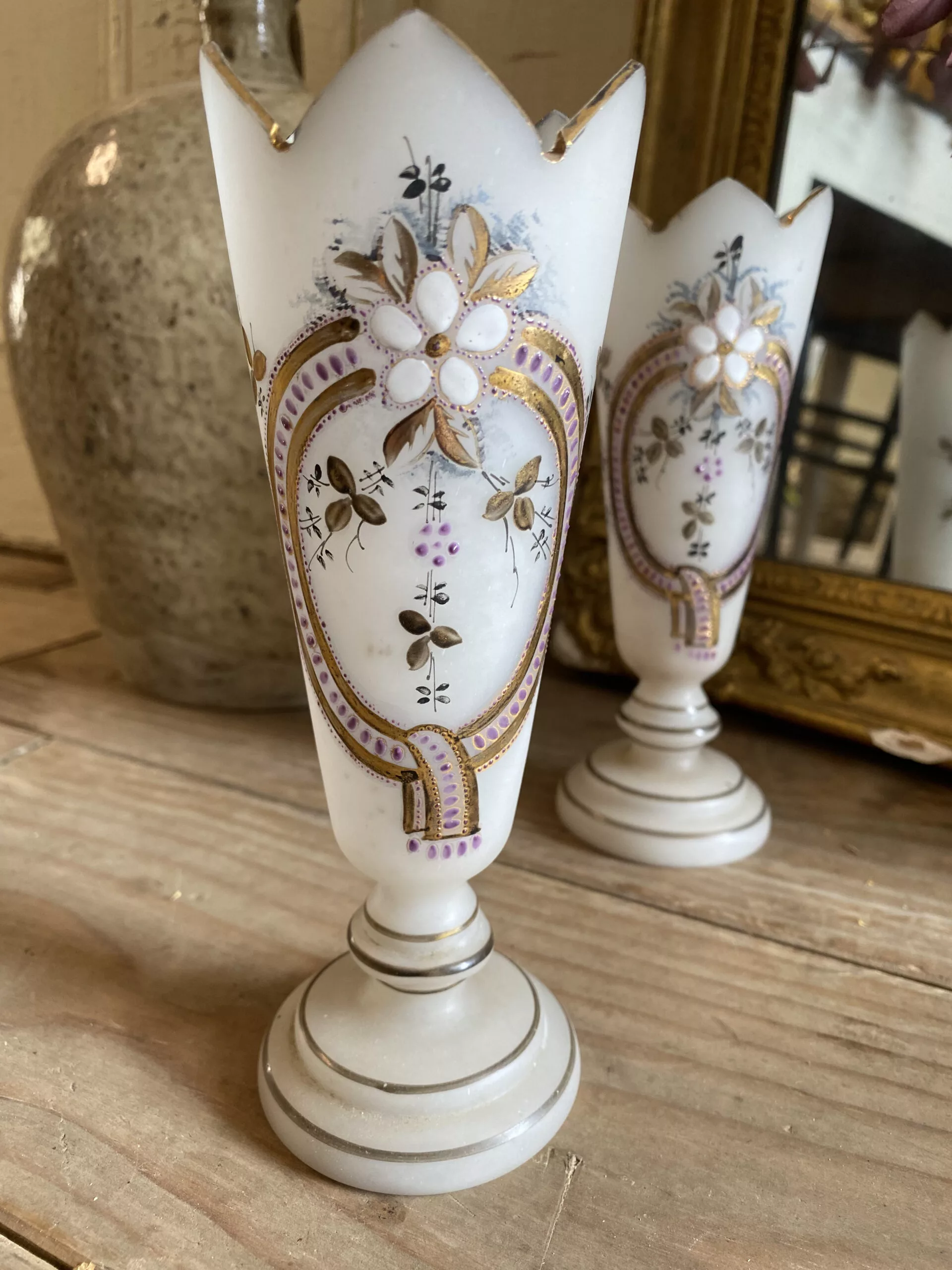 Deux vases en opaline à décors floraux, émaillés et monogrammés sous la base GG