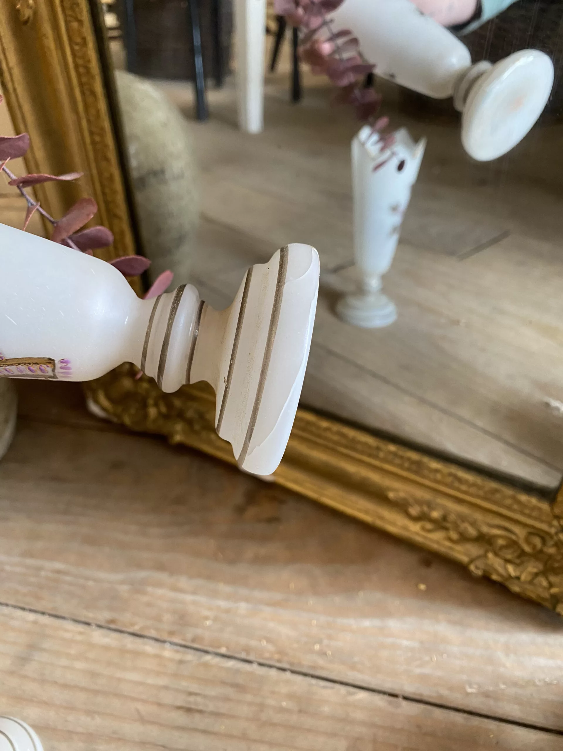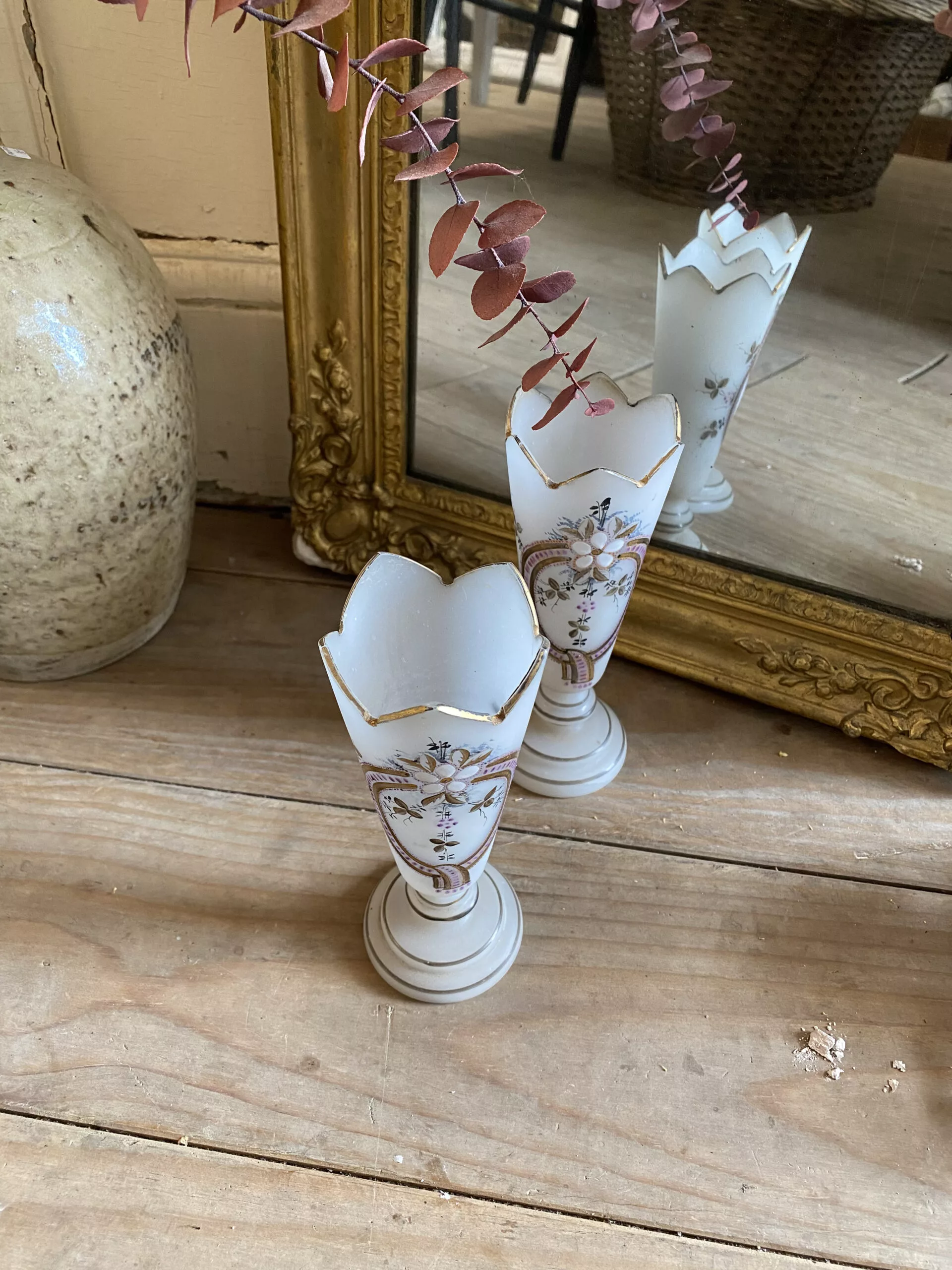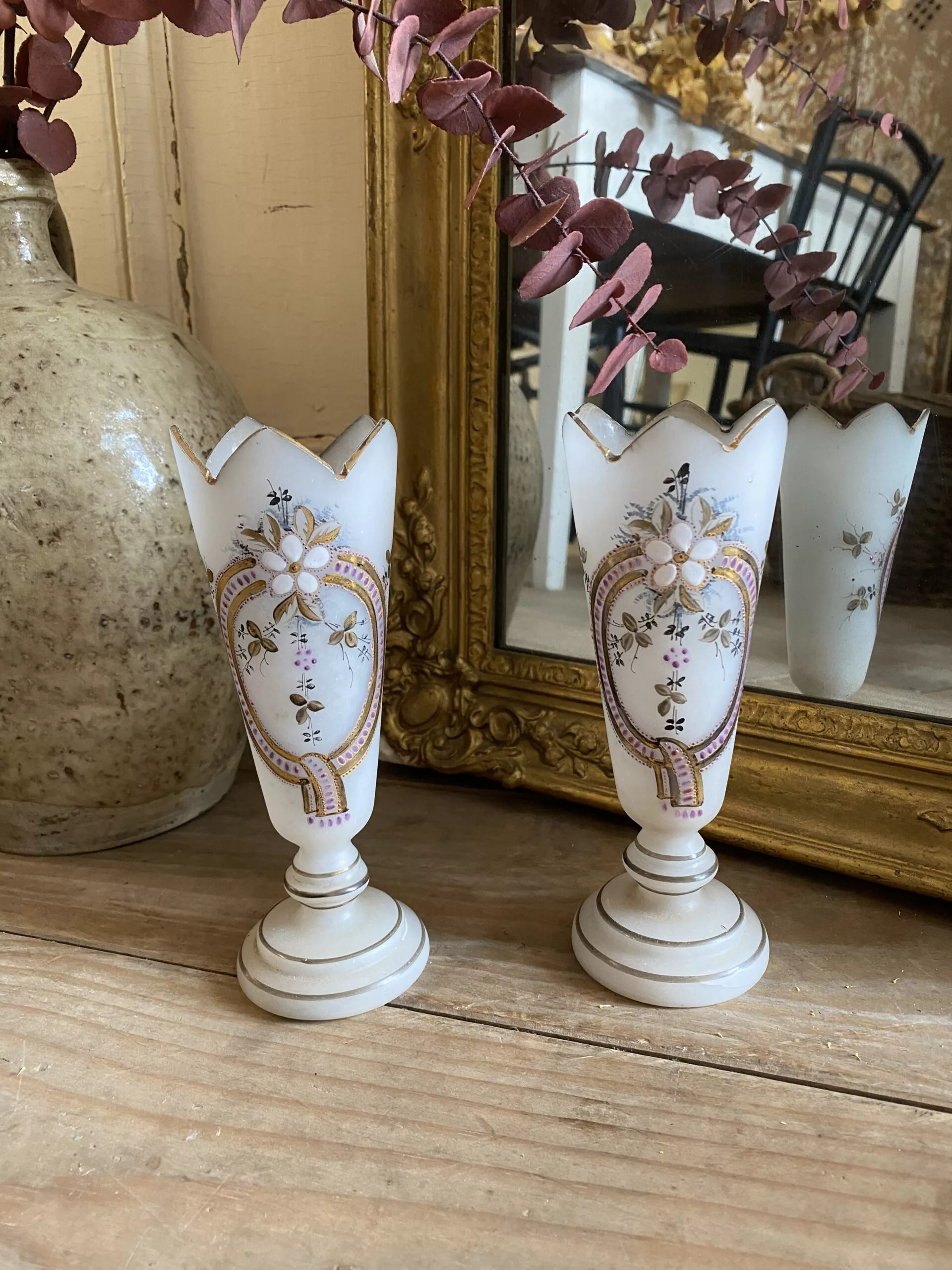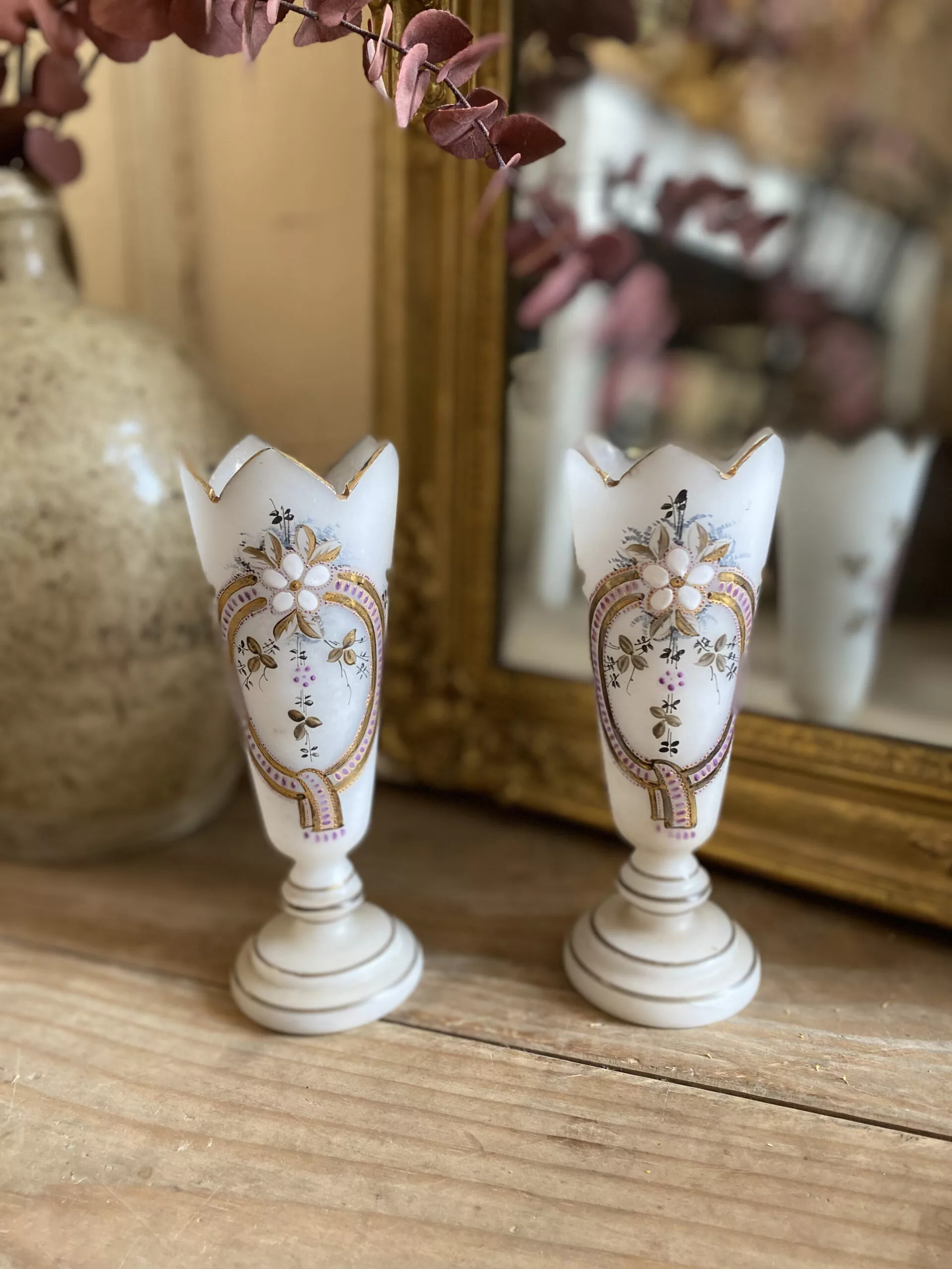 Deux vases en opaline à décors floraux, émaillés et monogrammés sous la base GG