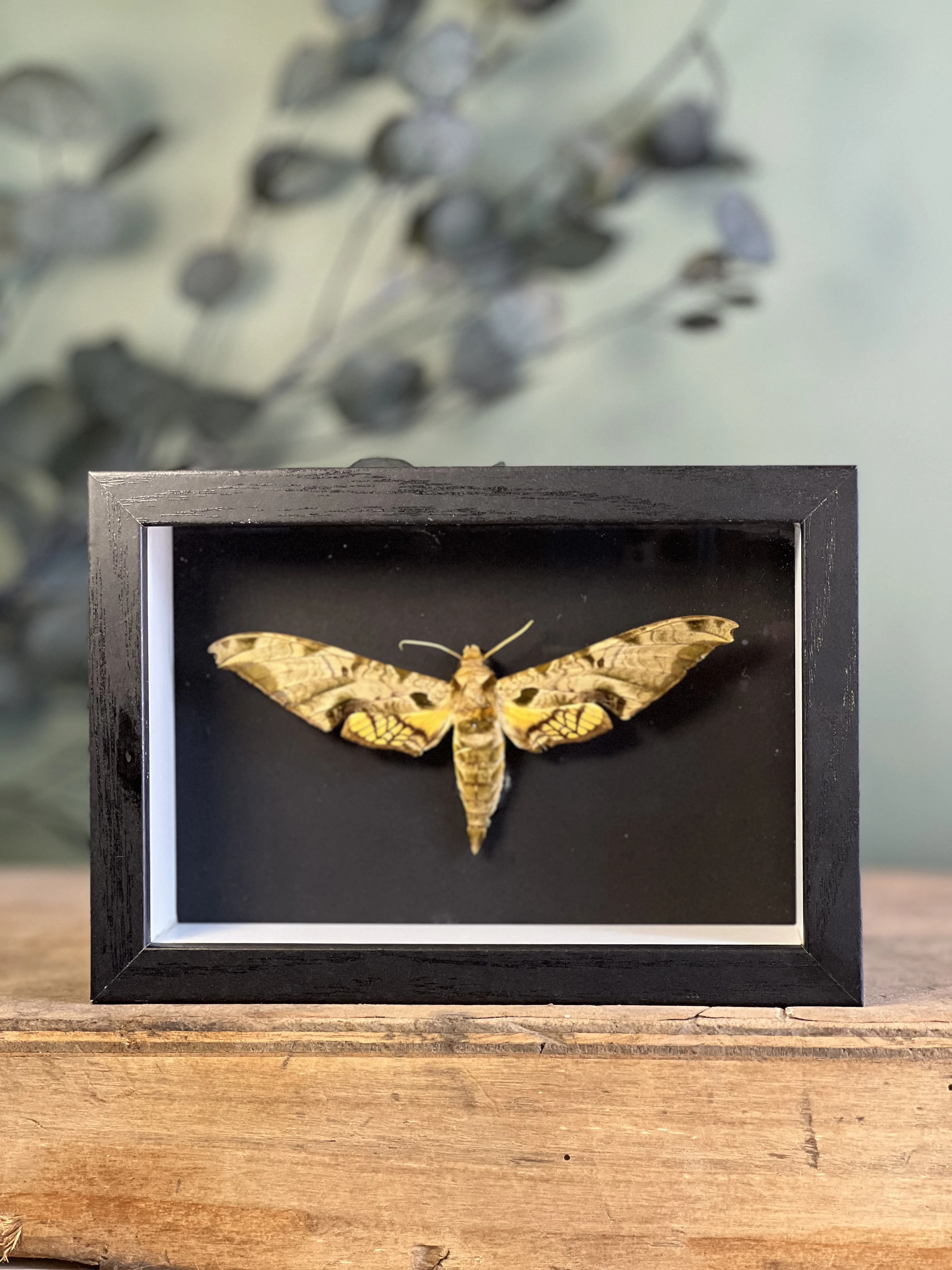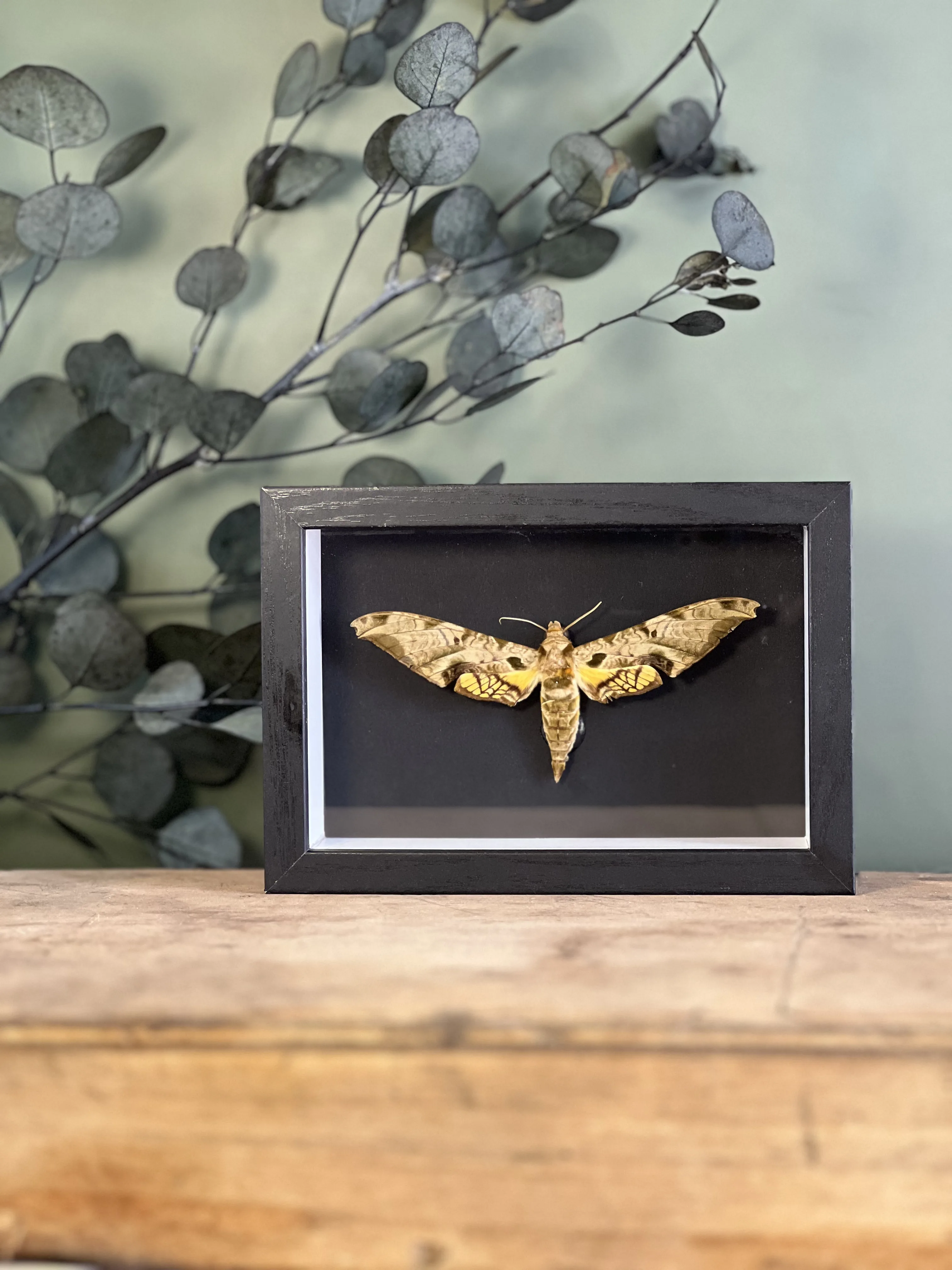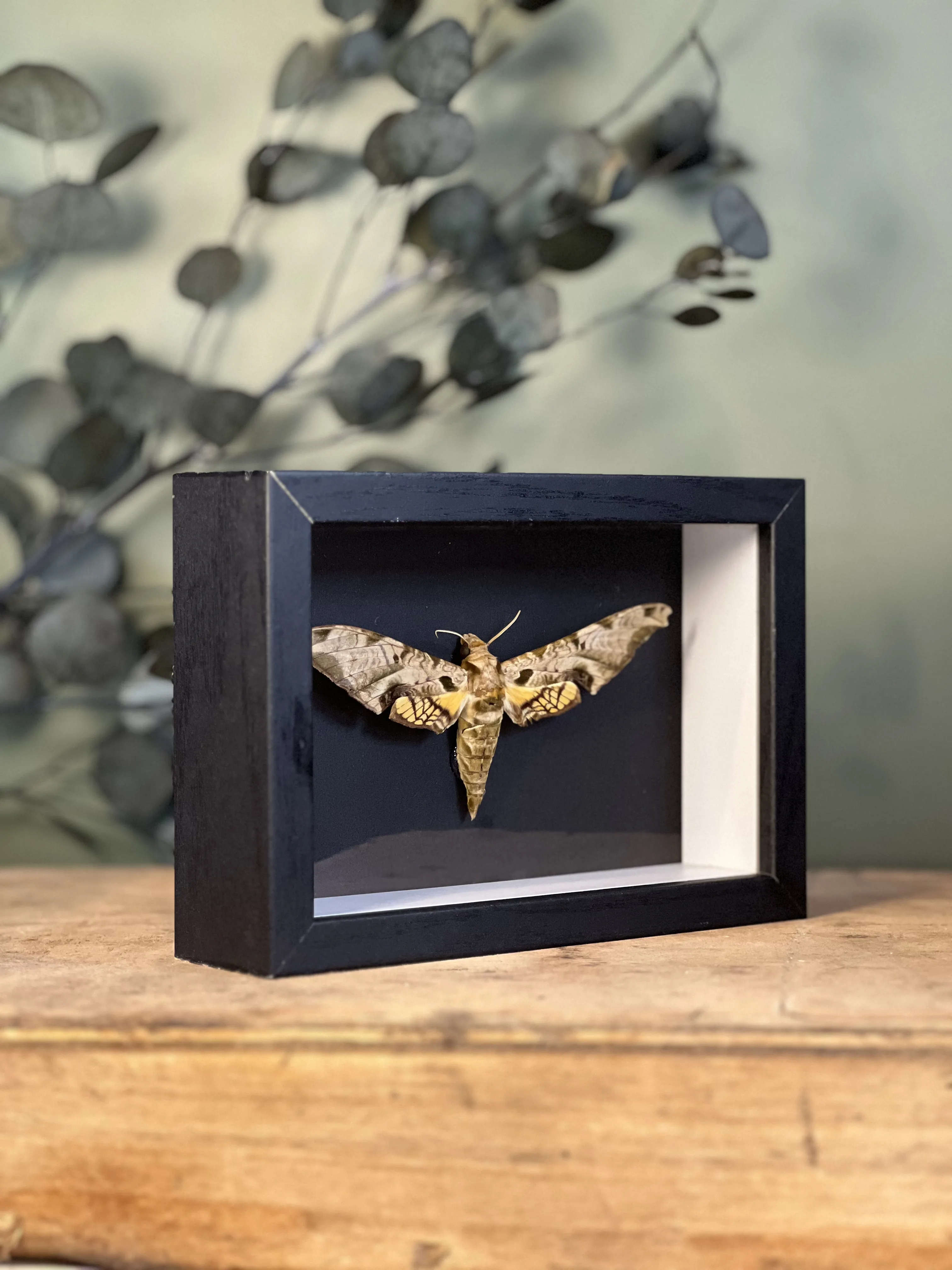 Superbe spécimen de Protambulyx eurycles, collecté au Pérou en 1975, présenté dans un cadre noir avec vitre en verre afin d’assurer sa protection tout en mettant en valeur son élégance naturelle.