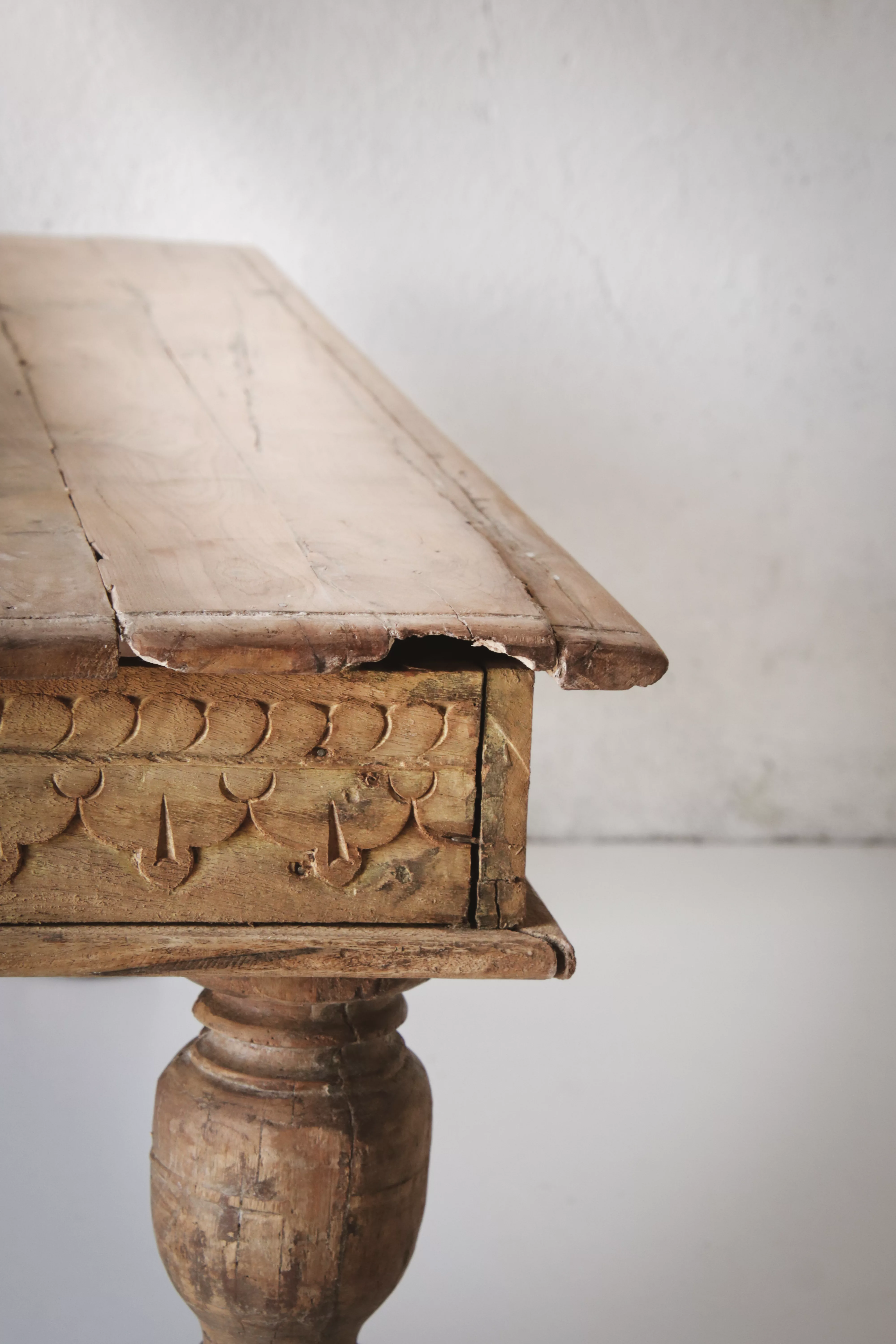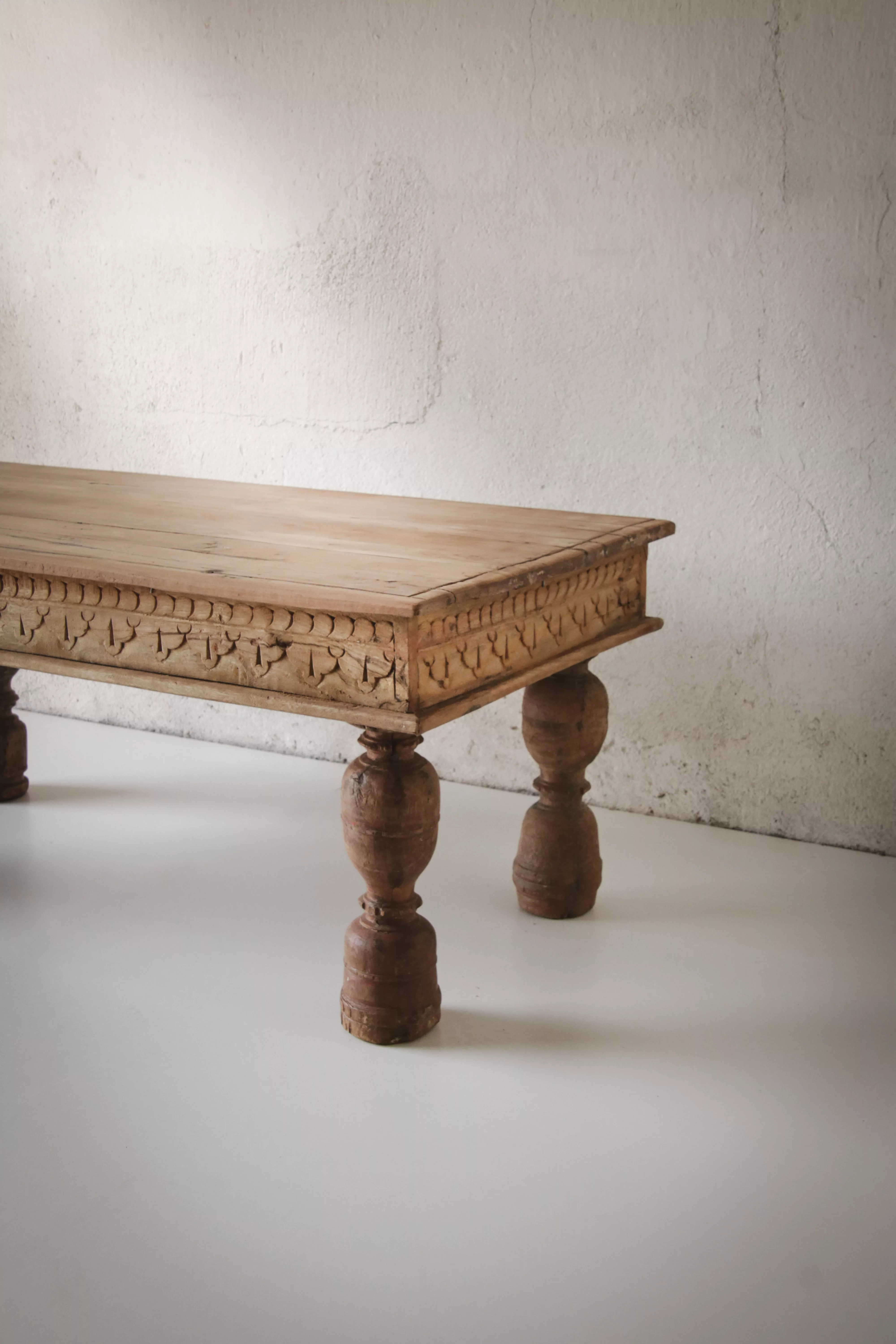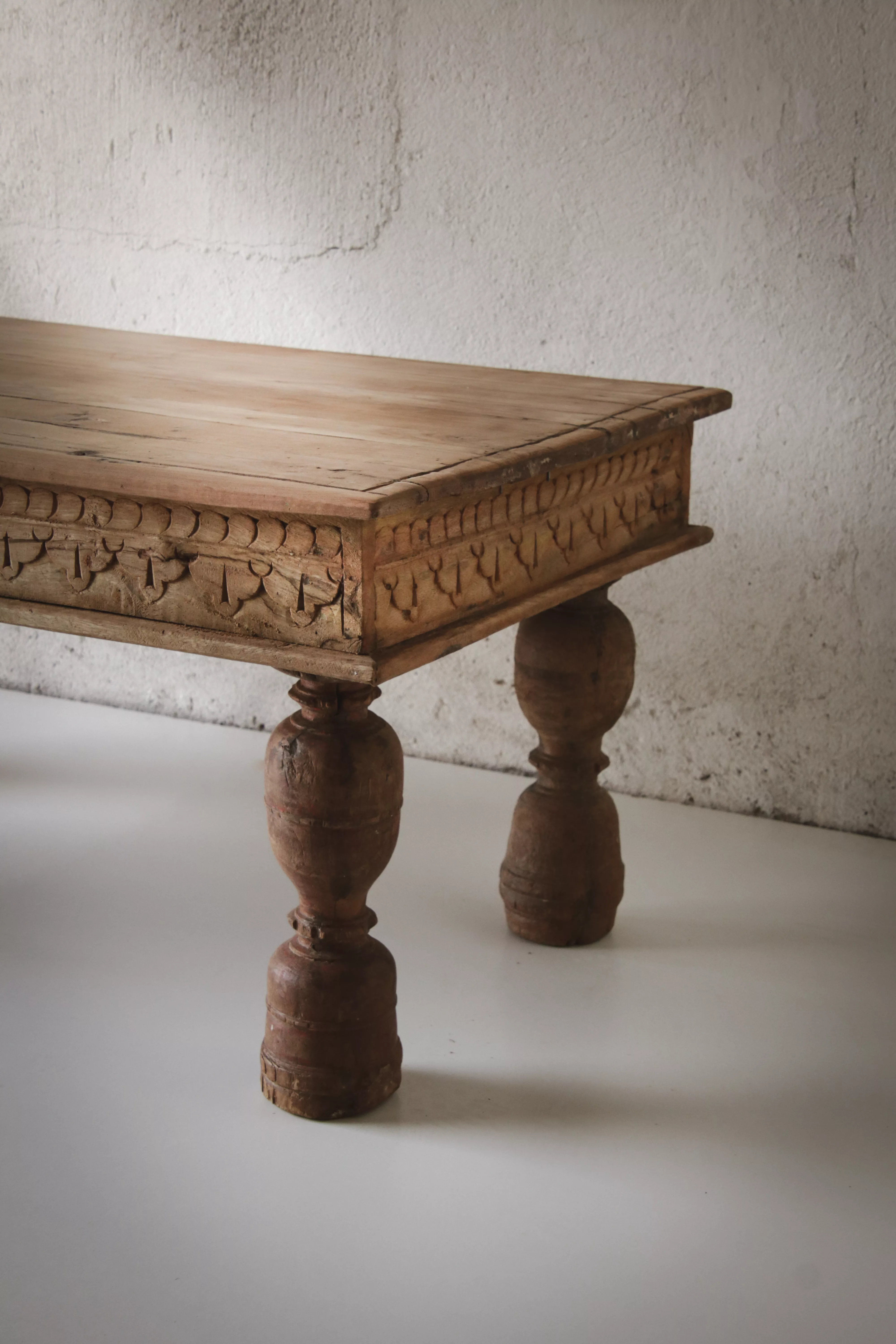 Avec son charme brut et sa silhouette pleine de caractère, cette table basse en bois massif d’origine indienne incarne l’authenticité des meubles ethniques. Son plateau marqué par le temps révèle la beauté des irrégularités naturelles du bois, témoins de son histoire et de son savoir-faire artisanal. Les pieds tournés, typiques des créations traditionnelles indiennes, apportent une touche de raffinement qui contraste avec la simplicité du plateau. Chaque détail, chaque nuance et chaque trace de sa patine en font une pièce unique, chargée de poésie et d’exotisme. Plus qu’un meuble, cette table basse raconte un voyage et s’intègre aussi bien dans un intérieur bohème, campagne chic que dans un décor contemporain où elle apportera une note d’authenticité.